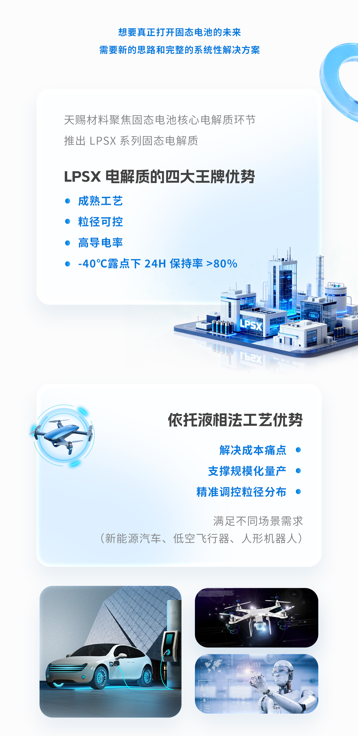 依托液相法工艺的成熟优势,天赐自主开发的LPSX系列硫化物固态电解质实现了对粒径分布的精准调控,兼具高离子电导率与成本可控性,可灵活匹配新能源汽车、低空飞行器及人形机器人等多元应用场景,成为推动固态体系量产化的关键材料之一。