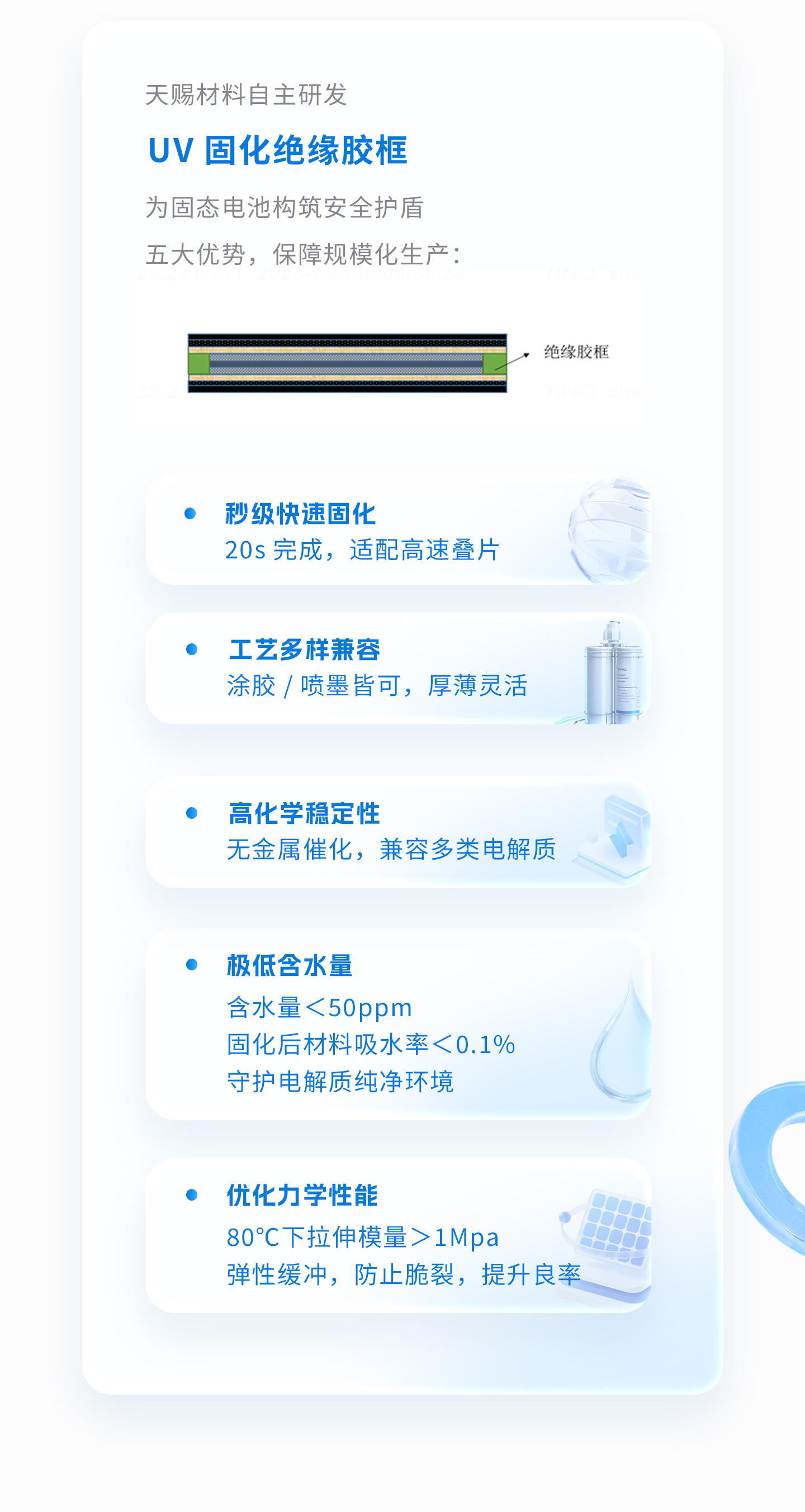 与此同时,天赐材料还推出了UV固化绝缘胶框系统,该材料具备秒级固化、优异化学惰性、极低含水量与出色的力学缓冲性能,可有效防止界面脆裂、提升电芯良率,为固态电池的稳定运行与大规模生产提供坚实保障。