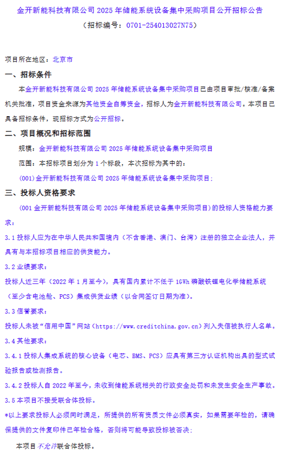 北极星储能网讯:8月28日,金开新能科技有限公司2025年储能系统设备集中采购项目招标。招标人为金开新能科技有限公司,为天津市国资委旗下企业。