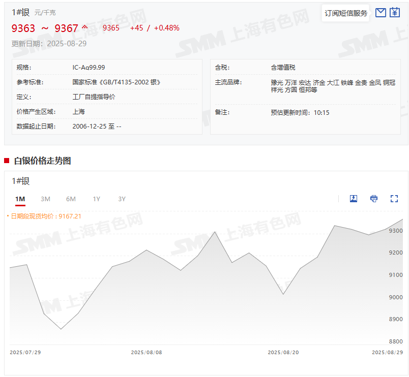 白银现货连续2个交易日出现小幅上涨。8月29日,SMM1# 白银上午出厂参考均价为9365元/千克,均价较前一交易日上涨45元/千克,涨幅为0.48%。据SMM了解,上海地区现款现货的国标银锭仓单对TD升水维持4-5元/千克报价或对沪期银2510合约贴水20元/千克报价,但下游询价减少市场成交寡淡,个别持货商对沪期银2510合约贴水24-26元/千克少量抛售。大厂银锭对TD升水6-8元/千克报价,持货商出货意向较低报价坚挺。银价走强接近年内高位,下游终端用户观畏跌慎采,普遍观望,临近月底关账叠加基差收窄,贸易商出货积极性亦有所下滑,市场成交转淡。