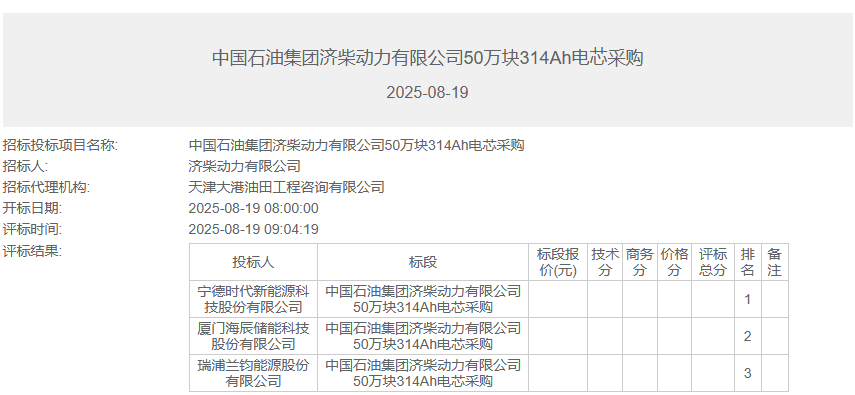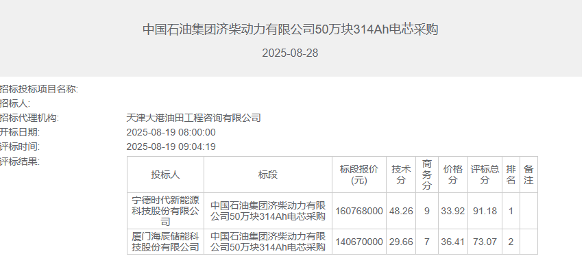 北极星储能网网获悉,8月28日,中国石油集团济柴动力有限公司50万块314Ah电芯采购评标结果公布,中标人为宁德时代新能源科技股份有限公司和厦门海辰储能科技股份有限公司。