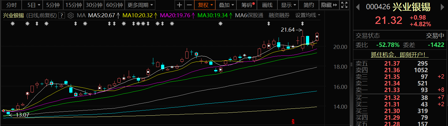 8月29日,兴业银锡股价出现明显上涨,截至29日14:41分,兴业银锡涨4.82%,报21.32元/股。