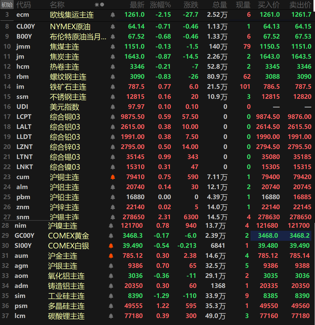 此外,碳酸锂主连涨0.39%,多晶硅主连涨1.22%,工业硅跌1.29%。欧线集运主连跌2.15%报1261。