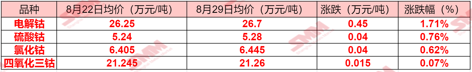 SMM 8月29日讯:本周钴系产品现货报价呈现集体上行的态势,其中电解钴现货报价在冶炼厂和贸易商的共同挺价下,价格单周上涨4500元/吨,其余钴系产品现货报价也录得不同程度的上涨……SMM整理了本周钴系产品的价格变动情况,具体如下:
