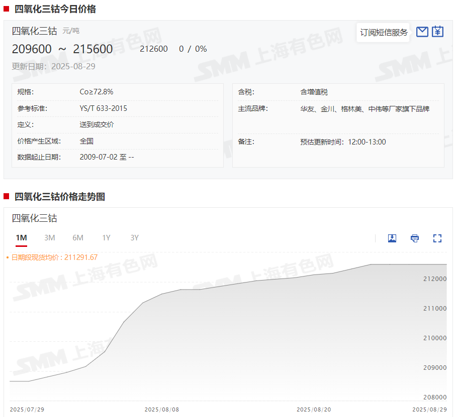 据SMM现货报价显示,本周四氧化三钴现货报价在首个交易日小幅上涨150元/吨之后便维持稳定,截至8月29日,四氧化三钴现货报价暂时持稳于20.96~21.56万元/吨,均价报21.26万元/吨,较8月22日涨幅达0.07%。