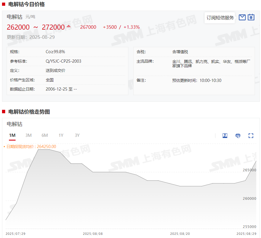 本周电解钴现货报价在本周整体呈现震荡上行的态势,截至8月29日,电解钴现货报价涨至26.2~27.2万元/吨,均价报26.7万元/吨,较8月22日上涨4500元/吨,涨幅达1.71%。