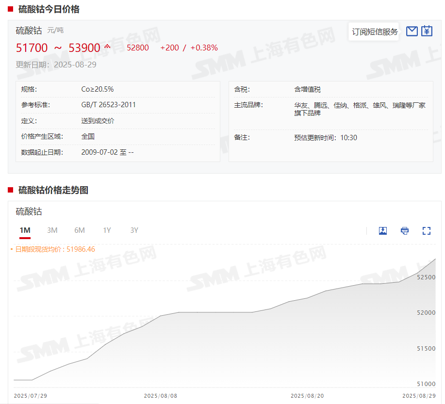 据SMM现货报价显示,硫酸钴现货报价在本周同样呈现上涨态势,截至8月29日,硫酸钴现货报价涨至5.17~5.39万元/吨,均价报5.28万元/吨,较8月22日上涨400元/吨,涨幅达0.76%。