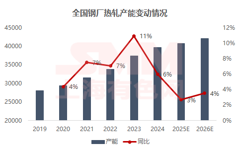 据SMM统计,2025年全国新投产热轧产能为1058万吨,暂不考虑下半年有新投产的热轧产能来看的话,2025年全国总产能预计约为40664万吨,同比2024年增长3%,与2023-2024年产能增速相比明显放缓。
