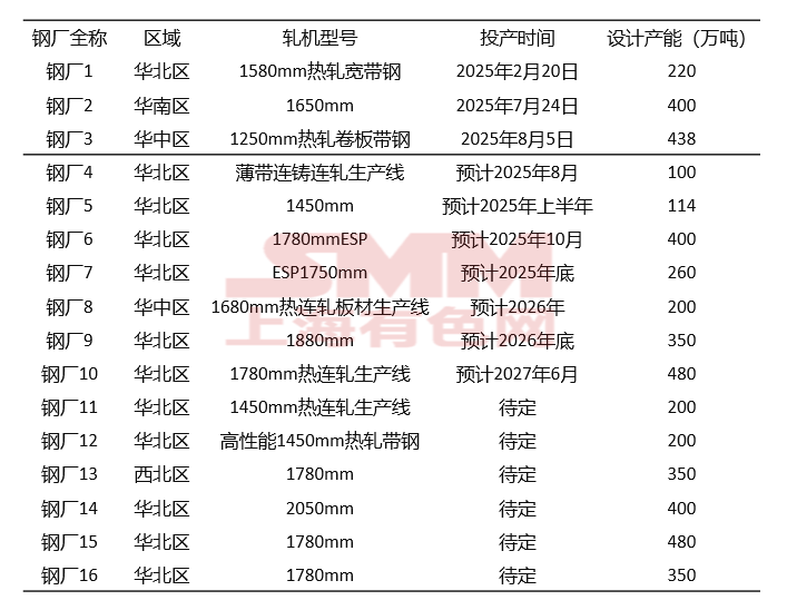 国内钢厂热轧产线投产情况,SMM将持续跟踪。