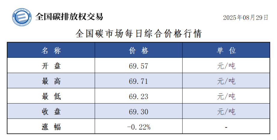 今日全国碳市场综合价格行情为: 开盘价69.57元/吨,最高价69.71元/吨,最低价69.23元/吨,收盘价69.30元/吨,收盘价较前一日下跌0.22%。