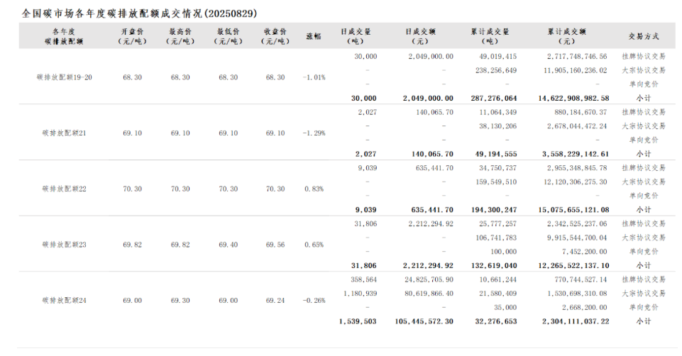 截至2025年8月29日,全国碳市场碳排放配额累计成交量695,666,559吨,累计成交额47,826,426,420.59元。