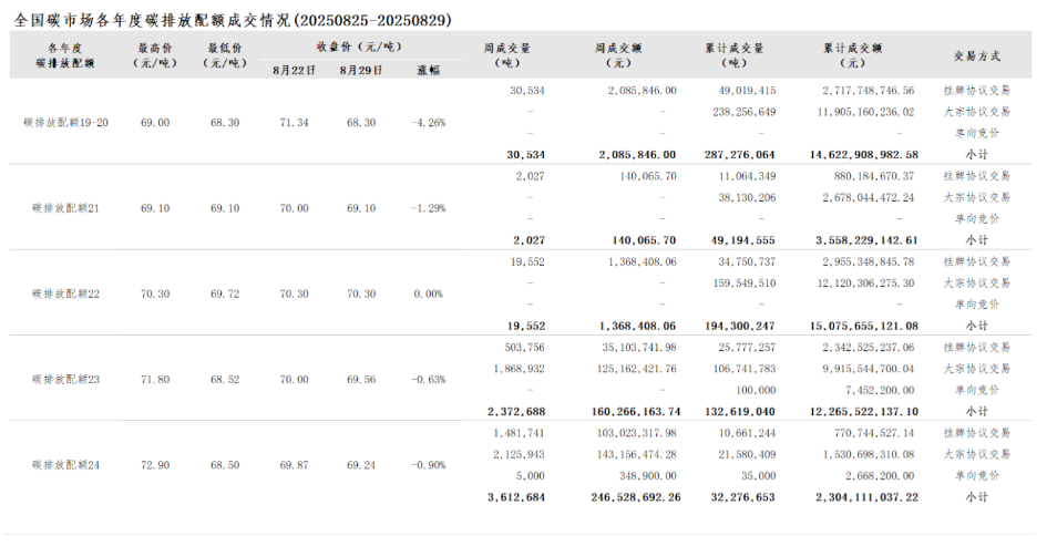 2025年1月1日至8月29日,全国碳市场碳排放配额成交量65,397,895吨,成交额4,793,699,317.08元。