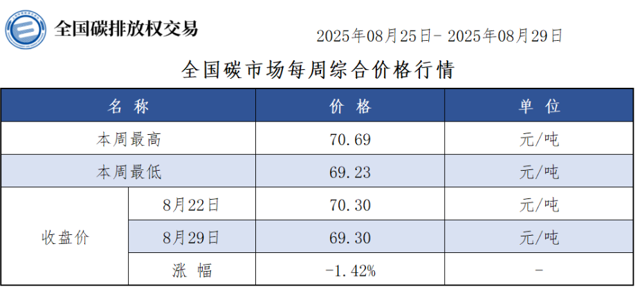 本周全国碳市场综合价格行情为:最高价70.69元/吨,最低价69.23元/吨,收盘价较上周五下跌1.42%。