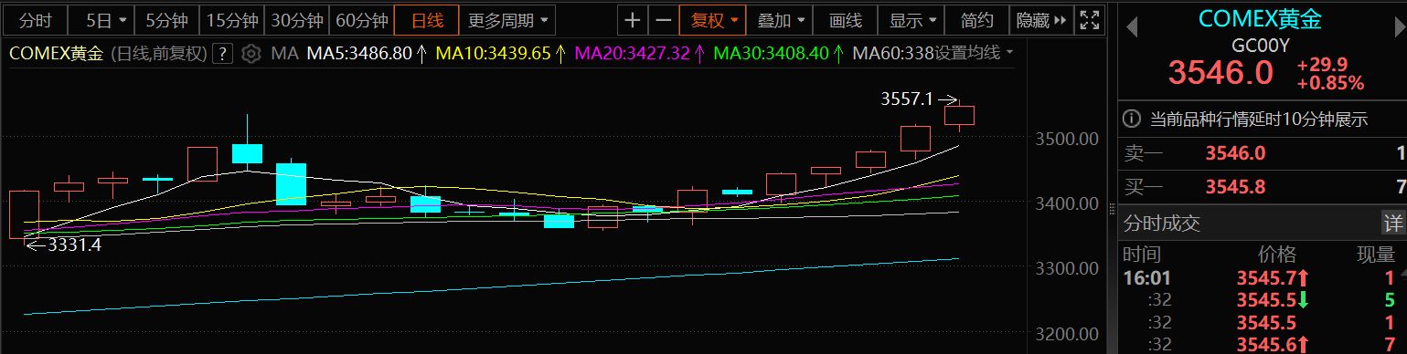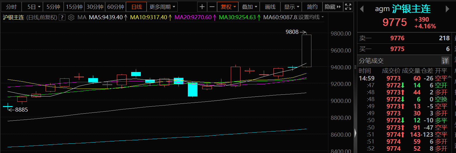 美国7月核心PCE小幅上升,但符合预期,未动摇当前美联储9月降息的预期 ,美联储降息预期使得贵金属的吸引力增加,国际金价当日走高,白银作为贵金属之一,也受益于这一预期,吸引了更多资金流入白银市场,推动银价上涨;特朗普关税政策升级,市场担忧情绪重燃,地缘政治风险和全球贸易摩擦持续升级,强化了贵金属作为避险资产的配置价值;市场对美联储独立性的担忧也提振了避险情绪;国际白银协会预计2025年全球白银工业需求将增长5%,供需缺口扩大至4000吨,白银工业品属性需求增加预期也吸引了部分市场资金对白银的青睐;COMEX黄金突破关键位置,金银比修复驱动银价飙升,截至9月1日16:11分,COMEX黄金涨0.83%,报3545.4美元/盎司,盘中刷新历史新高至3557.1美元/盎司;COMEX白银涨1.79%,报41.45美元/盎司,盘中刷新自2011年9月以来的新高至41.64美元/盎司;沪金主连涨2.08%,报800.56元/克,盘中刷新3个多月的高点至802.38元/克;沪银主连涨4.16%,报9775元/千克,盘中刷新上市以来的历史新高至9808元/千克;白银T+D涨4.15%,报9775元/千克,盘中刷新上市以来的历史新高至9779元/千克。