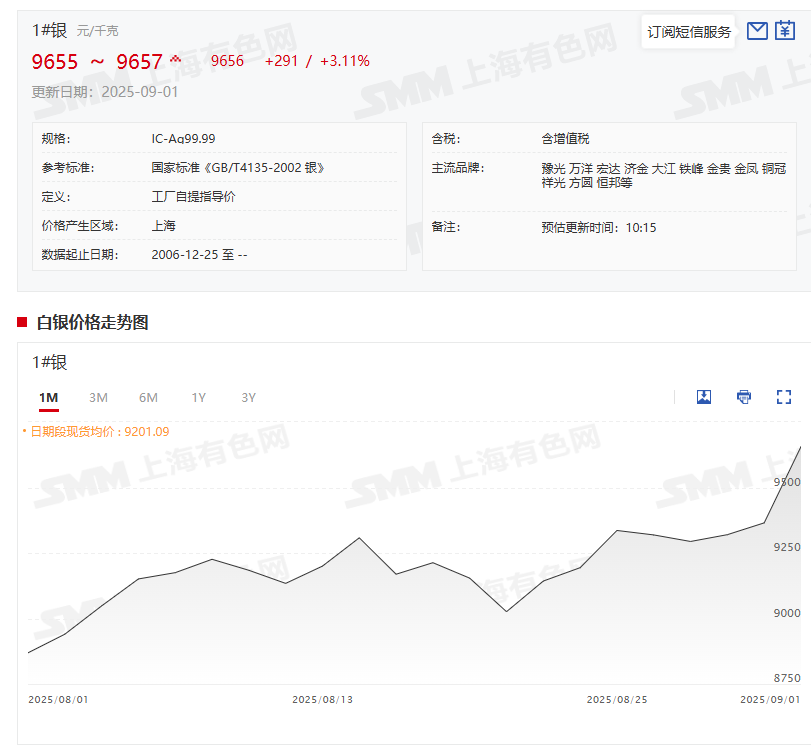 在沪银和白银T+D均刷新了上市以来的新高之后,白银现货价格出现大幅上涨,9月1日,SMM1#白银上午出厂参考均价为9656元/千克,均价较前一交易日上涨291元/千克,涨幅为3.11%。据SMM了解,银价突破新高后,下游畏高保持观望状态,冶炼厂企业纷纷逢高甩货,现货供应转为供大于求,期现价差仅30元以内,保值需补保证金,贸易商采购接货积极性转淡。日内现货市场上,持货商对TD升水下调至0-3元/千克,下游普遍议价观望,市场存在部分投机商甩货,出现少量TD贴水成交,主流成交在平水附近。
