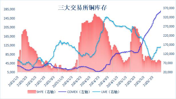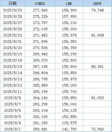 以下为2025年8月以来三大交易所铜库存数据:(单位:吨)