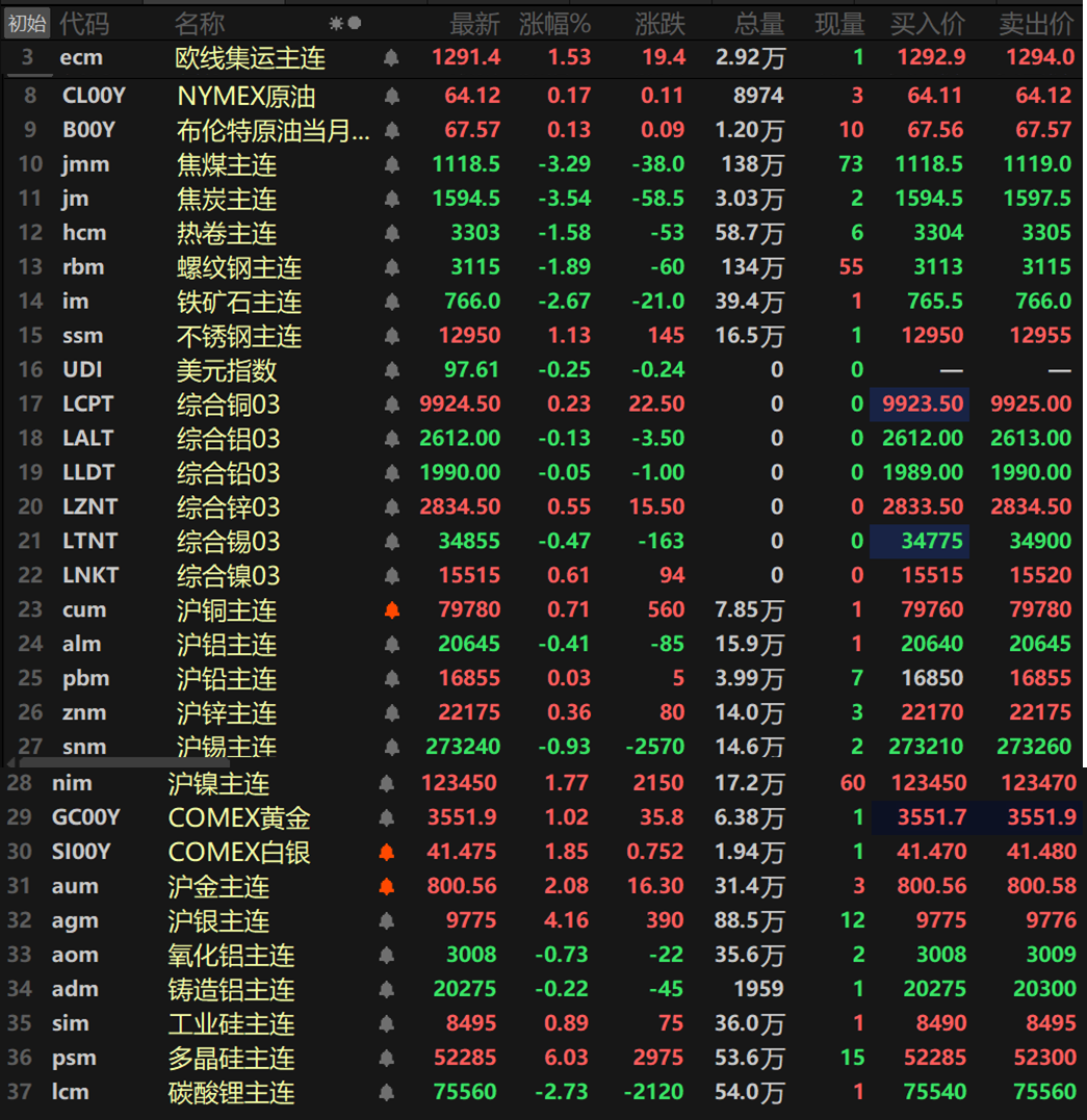 此外,碳酸锂主连跌2.73%,多晶硅主连午后开盘快速拉涨,收盘涨幅高达6.03%。工业硅主连涨0.89%。欧线集运主连涨1.53%报1291.4。