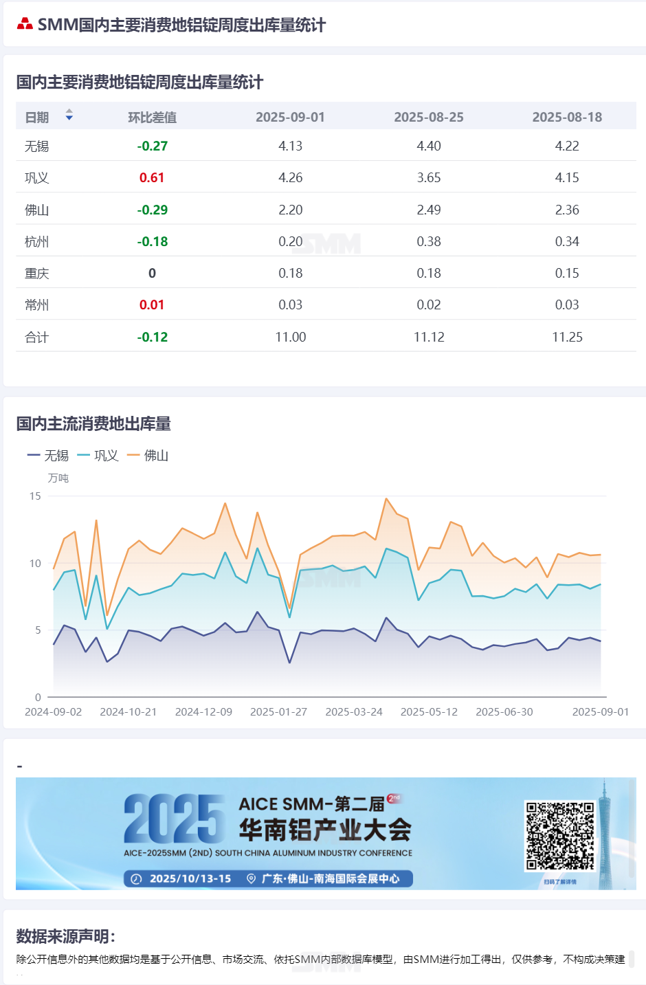 【SMM国内铝锭出库统计】 据SMM统计,8.25-8.31期间国内铝锭出库量共计11万吨,环比减少0.12万吨。