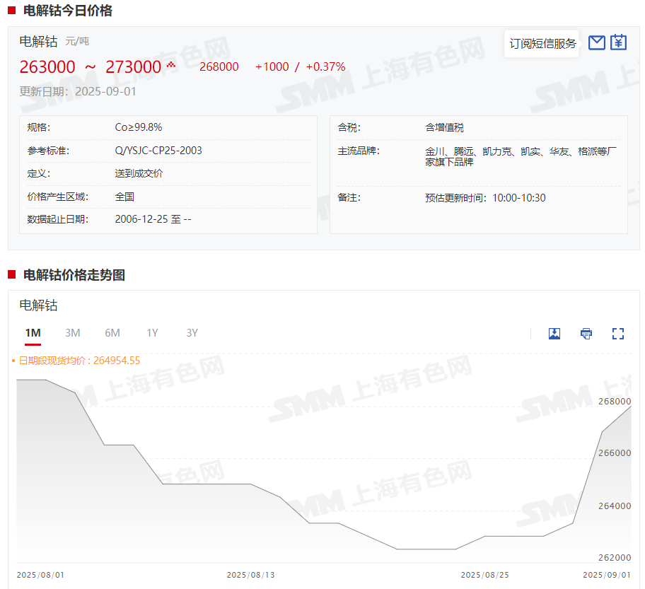 消息面上,电解钴现货报价自8月25日以来整体呈现震荡反弹的态势,截至9月1日,电解钴现货报价已经涨至26.3~27.3万元/吨,均价报26.8万元/吨,较8月22日的低点26.25万元/吨上涨5500元/吨,涨幅达2.1%。