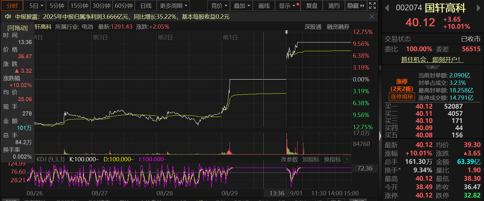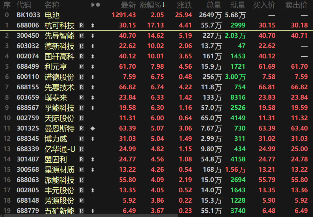 电池指数也在收盘以2.05%的涨幅报1291.43,盘中最高触及1297.6的高位,刷2023年3月以来的新高。个股方面,杭可科技、先导智能一同涨逾14%,德新科技、国轩高科涨停封板,利元亨、诺德股份、先惠技术等一同涨逾6%。