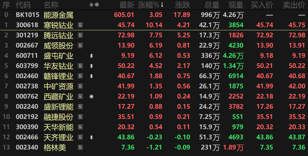SMM 9月1日讯:9月1日早间,能源金属以及电池、固态电池板块一同冲高,能源金属板块指数盘中一度涨逾3.5%,最高冲至608.32的高位,刷2023年5月以来的新高。个股方面,寒锐钴业收盘涨10.14%,腾远钴业涨7.75,威领股份、盛屯矿业、华友钴业等多股纷纷跟涨。