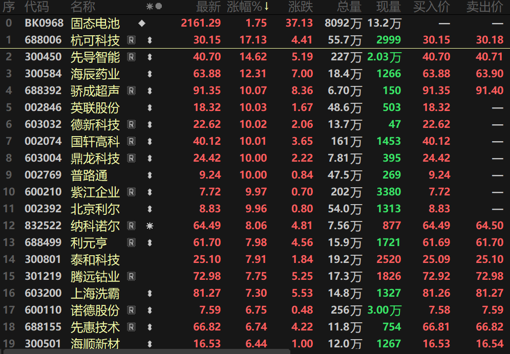 固态电池板块也一同上涨,收盘指数以1.75%的涨幅报2161.29,盘中一度触及2162.66的高位,刷2022年8月以来的新高。个股方面,鼎龙科技、普路通、紫江企业等7股涨涨停。