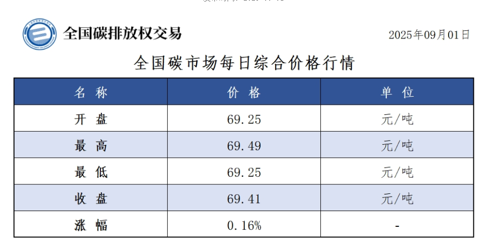 今日全国碳市场综合价格行情为: 开盘价69.25元/吨,最高价69.49元/吨,最低价69.25元/吨,收盘价69.41元/吨,收盘价较前一日上涨0.16%。