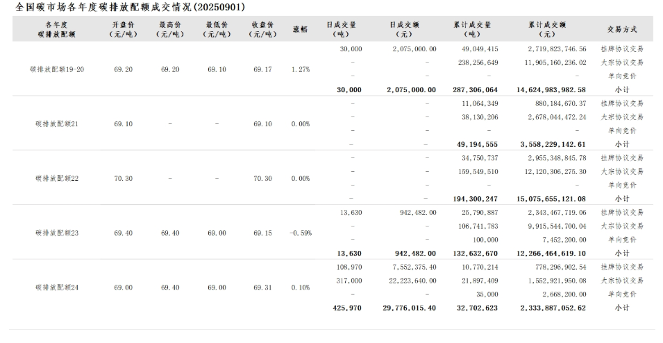 截至2025年9月1日,全国碳市场碳排放配额累计成交量696,136,159吨,累计成交额47,859,219,917.99元。