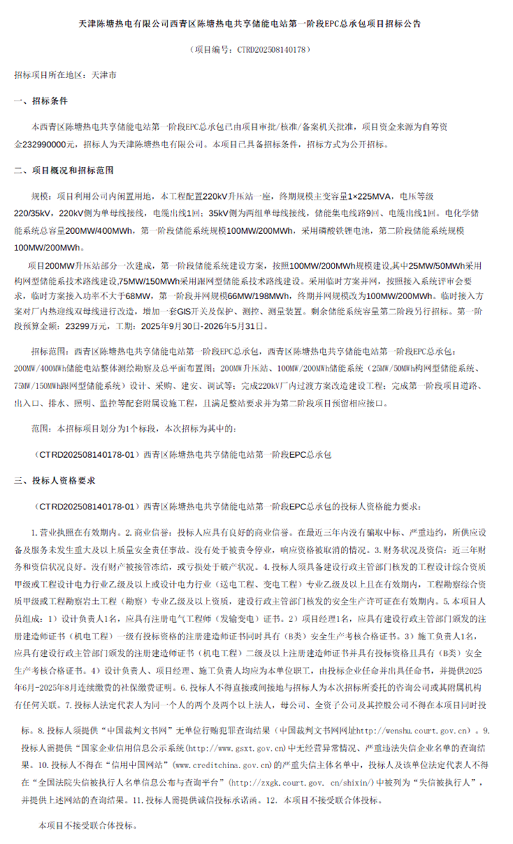 8月30日,天津陈塘热电有限公司西青区陈塘热电共享储能电站第一阶段EPC总承包项目招标公告发布。项目招标人为天津能源投资集团旗下的天津陈塘热电有限公司,项目电化学储能系统总容量200MW/400MWh,第一阶段储能系统规模100MW/200MWh,采用磷酸铁锂电池,第二阶段储能系统规模100MW/200MWh。本次招标范围为第一阶段EPC总承包。