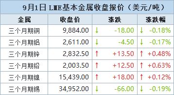 伦敦时间9月1日17:00(北京时间9月2日00:00),LME三个月期铜下跌18美元,或0.18%,收报每吨9,884.0美元。