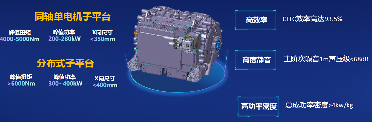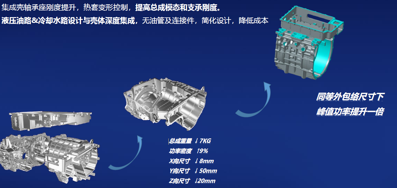 减速箱壳体,电机壳体,控制器壳体集成设计,一体式全内置循环油冷结构;