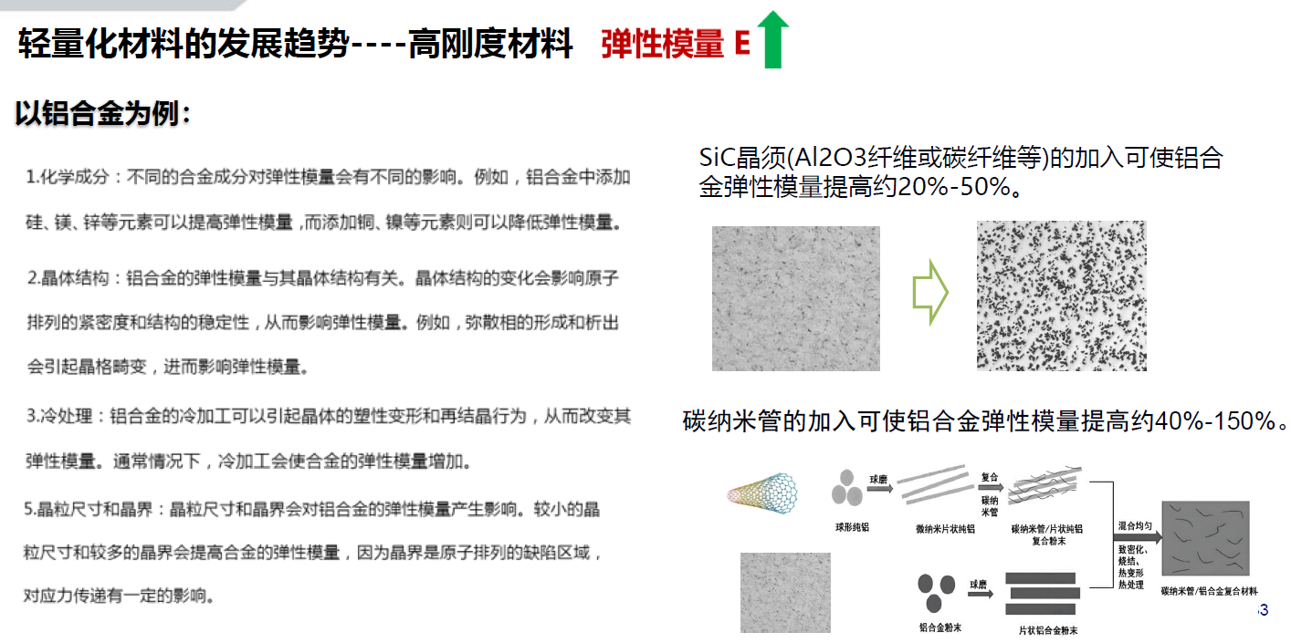 2. 材料是轻量化的基础,通过降低密度、提高静强度、提高弹性模量、提升疲劳强度,均能实现不同程度的轻量化,轻量化材料技术可沿此四个方向开展;