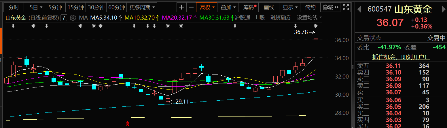 山东黄金9月2日出现上涨,截至13:38分,山东黄金涨0.36%,报36.07元/股。