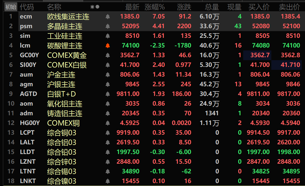 此外,铸造铝主连期货涨0.35%,氧化铝主连涨0.86%。碳酸锂主连跌2.35%,工业硅主连涨1.61%。多晶硅主连涨4.41%。