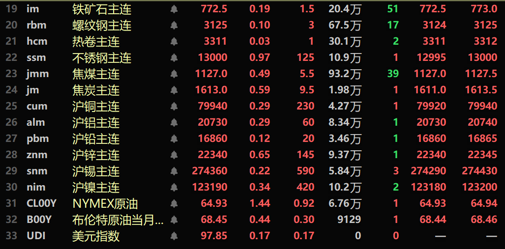 黑色系均飘红,铁矿涨0.19%,螺纹涨0.1%,热卷微涨。不锈钢涨0.97%。双焦方面:焦煤主力合约涨0.49%,焦炭主力合约涨0.59%。