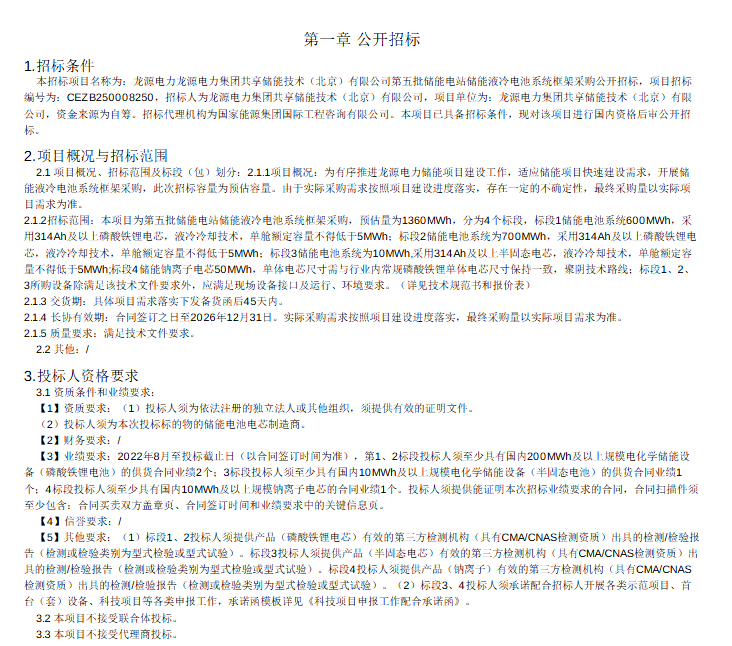 招标范围,预估量为1360MWh,分为4个标段,标段1储能电池系统600MWh,采用314Ah及以上磷酸铁锂电芯,液冷冷却技术,单舱额定容量不得低于5MWh;