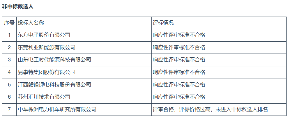 另外,东方电子股份有限公司、东莞利业新能源有限公司、山东电工时代能源科技有限公司、易事特集团股份有限公司、江西赣锋锂电科技股份有限公司、苏州汇川技术有限公司、中车株洲电力机车研究所有限公司7家企业未入围。