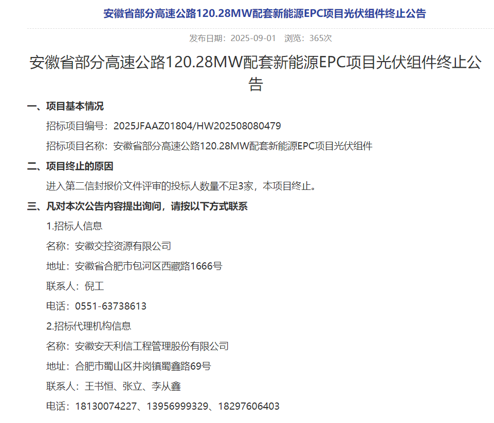9月1日,安徽省部分高速公路120.28MW配套新能源EPC项目光伏组件终止公告发布。公告显示,项目终止的原因为进入第二信封报价文件评审的投标人数量不足3家,本项目终止。