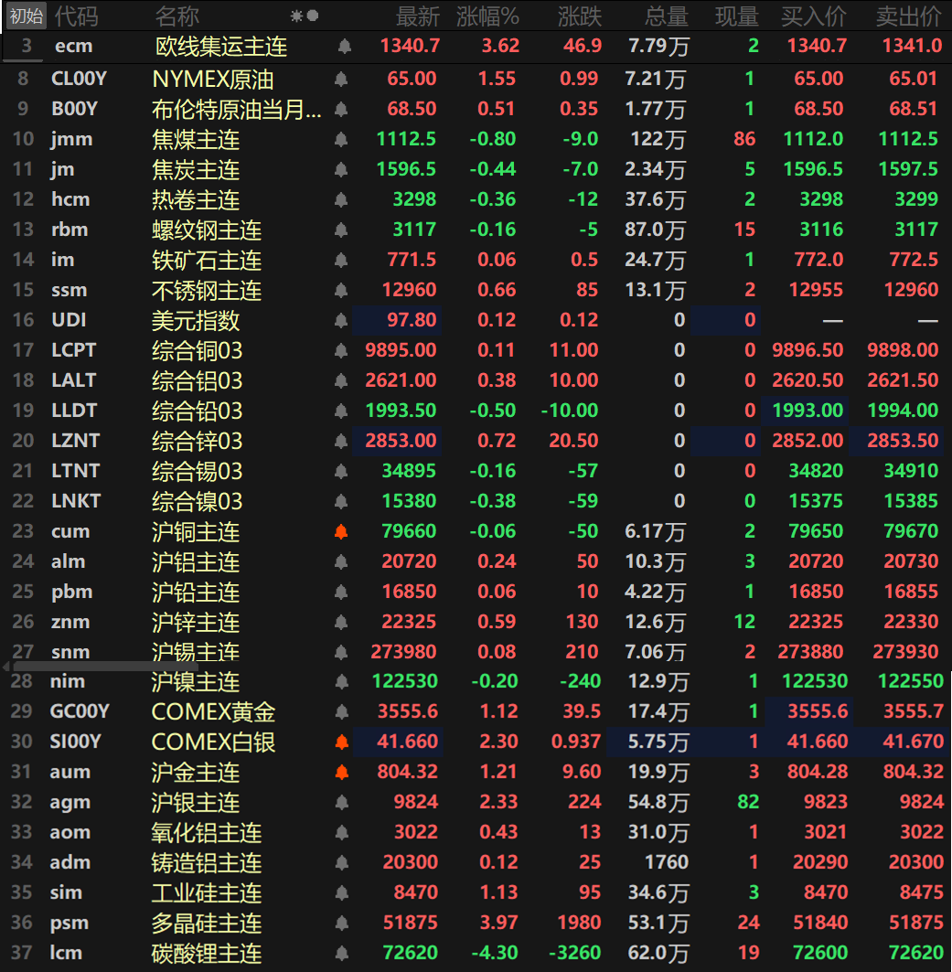 此外,碳酸锂主连跌4.3%,多晶硅主连涨3.97%,工业硅主连涨1.13%。欧线集运主连以3.62%的涨幅报1340.7。