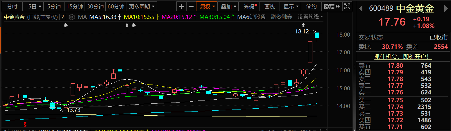 9月2日,中金黄金股价出现上涨,截至2日收盘,中金黄金涨1.08%,报17.76元/股。