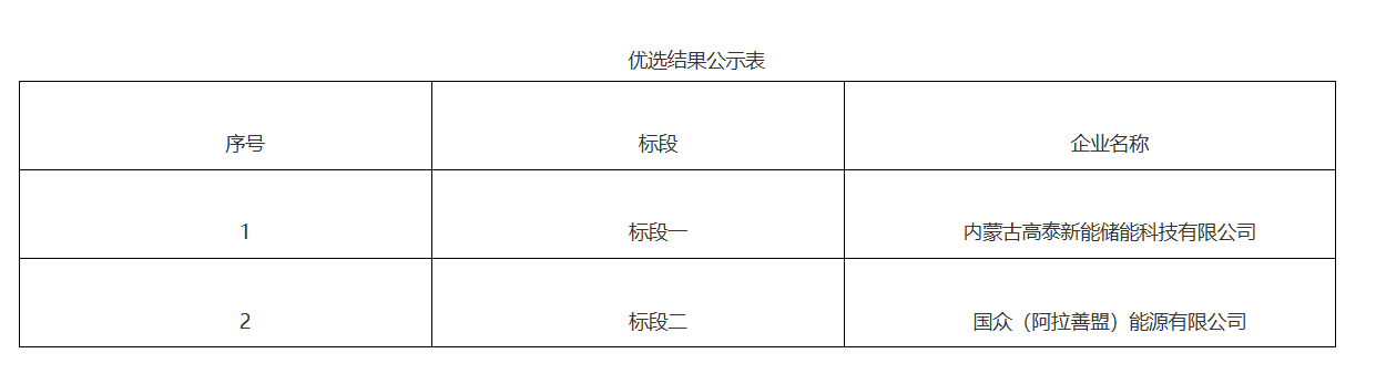 北极星储能网获悉,9月2日,内蒙古土默特左旗2025年电网侧独立新型储能电站项目开发主体优选结果公示,标段一优选结果为内蒙古高泰新能储能科技有限公司;标段二优选结果为国众(阿拉善盟)能源有限公司。