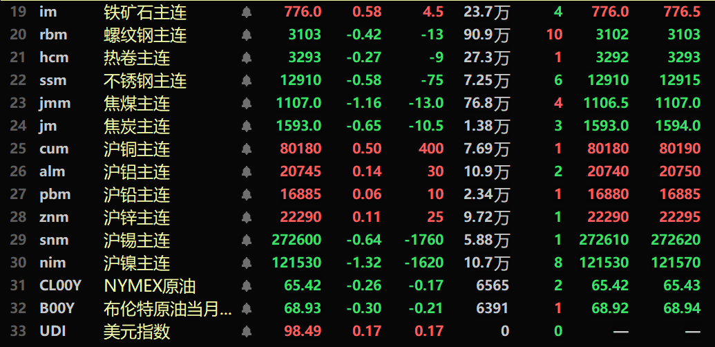 黑色系多飘绿,铁矿涨0.58%,螺纹跌0.42%,热卷跌0.27%。不锈钢跌0.58%。双焦方面:焦煤主力合约跌1.16%,焦炭主力合约跌0.65%。