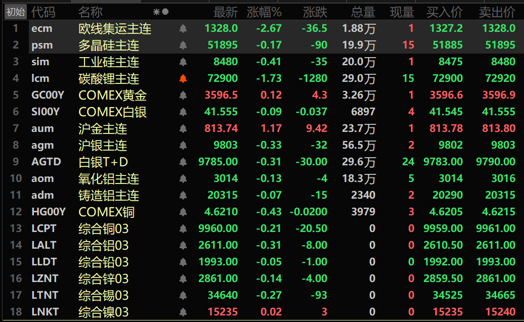此外,铸造铝主连期货跌0.07%,氧化铝主连跌0.13%。碳酸锂主连跌1.73%,工业硅主连跌0.41%。多晶硅主连跌0.17%。
