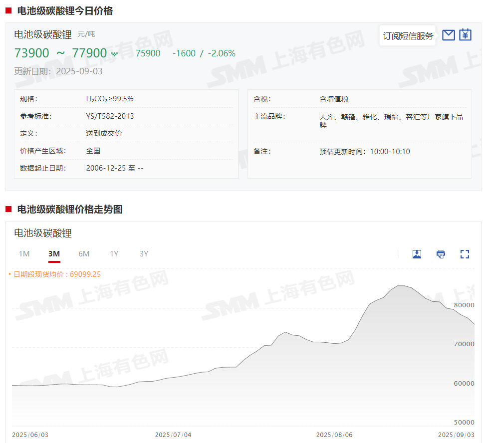 据SMM现货报价显示,上半年电池级碳酸锂现货均价报70398.89元/吨,相较2024年同期的103729.27元/吨下跌33330.38元/吨,跌幅达32.13%。