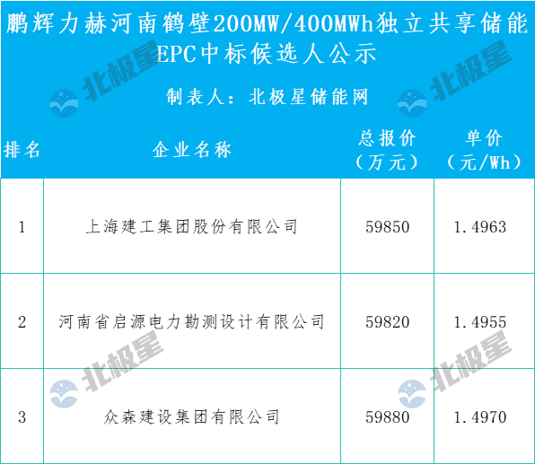 中标候选人第3名:众森建设集团有限公司,费率:99.80%,相当于投标报价59880万元,折合单价1.497元/Wh;