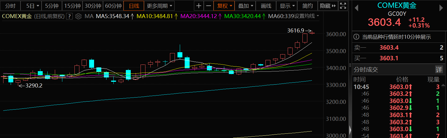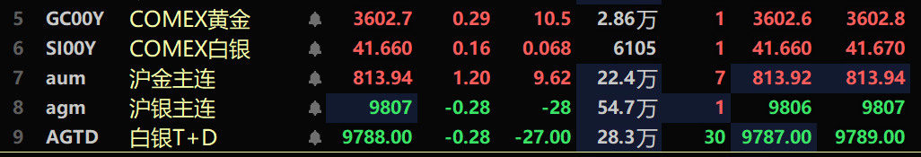 特朗普将就全球关税案裁决向美国最高法院提起上诉,美国政治前景不确定性增加;美国财政部长贝森特计划从周五开始对美联储主席候选人进行一系列密集面试,市场对美联储独立性担忧仍存;全球经济不确定性加剧,地缘政治冲突升级等推动市场避险情绪升温;美联储降息预期增强;贵金属期货价格上涨,COMEX黄金盘中突破 3600 美元,再创历史新高;以及部分贵金属公司上半年业绩大幅增长等带动贵金属板块出现逆势上涨,截至9月3日10:55分,COMEX黄金涨0.29%,报3602.7美元/盎司,盘中刷新历史新高至3616.9美元/盎司;COMEX白银涨0.16%,报41.66美元/盎司;沪金主连涨1.2%,报813.94元/克,盘中刷新4个多月的高点至816.78元/克;沪银主连跌0.28%,报9807元/千克;白银T+D跌0.28%,报9788元/千克克。