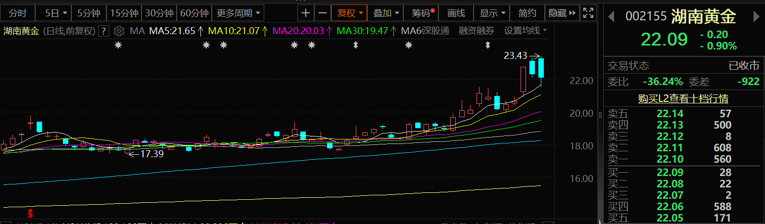 9月3日,湖南黄金的股价出现下跌,截至3日收盘,湖南黄金跌0.9%,报22.09元/股。