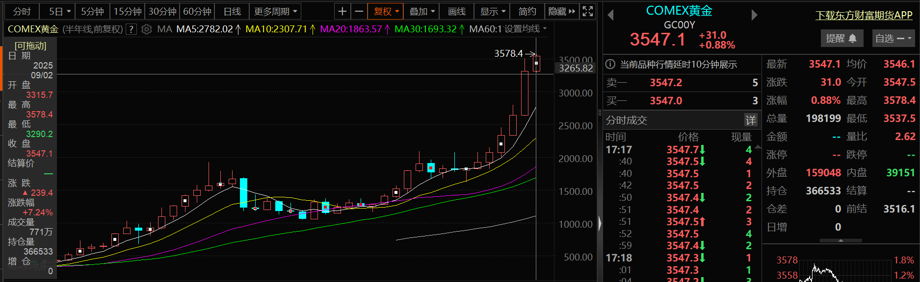 COMEX黄金2025年上半年的半年线涨幅为25.52%,进入下半年,其整体依然维持上涨的态势,截至9月2日17:28分,COMEX黄金涨0.88%,报3547.1美元/盎司,其盘中刷新COMEX黄金的历史新高至3578.4美元/盎司,COMEX黄金下半年的半年线涨幅暂时为7.24%。不少机构仍看好金价的后市表现:美国银行的分析师则预计,到2026年上半年国际金价将触及每盎司4000美元高位。华侨银行预计年末金价目标3570美元/盎司,2026年中上看3850美元。。瑞银集团日前称,随着美联储降息、美元走弱以及投资需求扩大,金价将延续涨势,该机构同时还上调了2026年上半年的金价预测。WayneGordon等瑞银财富管理部门分析师在报告中表示,将2026年3月末黄金目标价上调100美元,至每盎司3600美元;6月末目标价上调200美元,至每盎司3700美元。他们预测今年全球黄金需求预计将增长3%,达到4760吨,创2011年以来的最高水平。