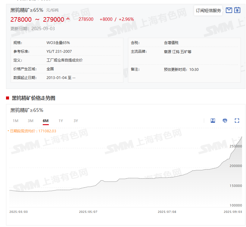 进入下半年,钨价的上涨趋势更为明显。9月3日,黑钨精矿(≥65%)延续了近期持续上涨的态势继续上行,其价格为278000~279000元/标吨,均价报278500元/标吨,较其前一交易日上涨2.96%。黑钨精矿(≥65%)9月3日278500元/标吨的均价与2024年12月31日的均价142750元/标吨相比,其均价今年以来上涨了135750元/标吨,今年以来的涨幅为95.1%。