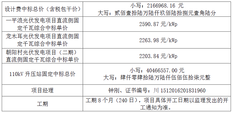 9月3日,一平浪光伏发电项目、龙木耳光伏发电项目、朝阳村光伏发电项目(二期)设计、采购、施工总承包(EPC)项目中标结果公布。中标单位是中全通技术有限公司(牵头人)、国昇设计有限责任公司(联合体成员),设计费中标总价(含税包干价)为2166968.16元,详情见下: